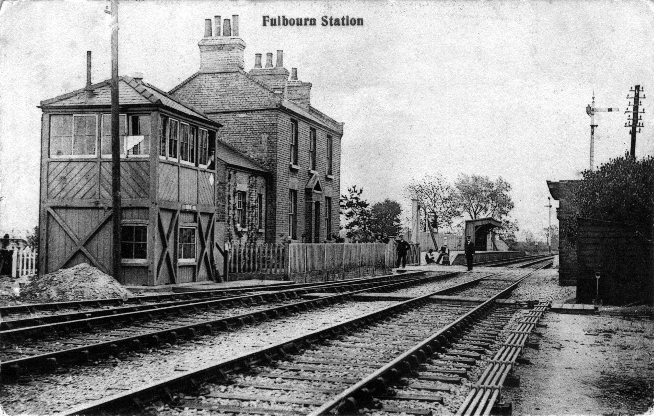 Scan of a postcard of Fulbourn Station, circa 1910. The photograph has been digitally edited to remove the worst stain marks from the sky, but not elsewhere.