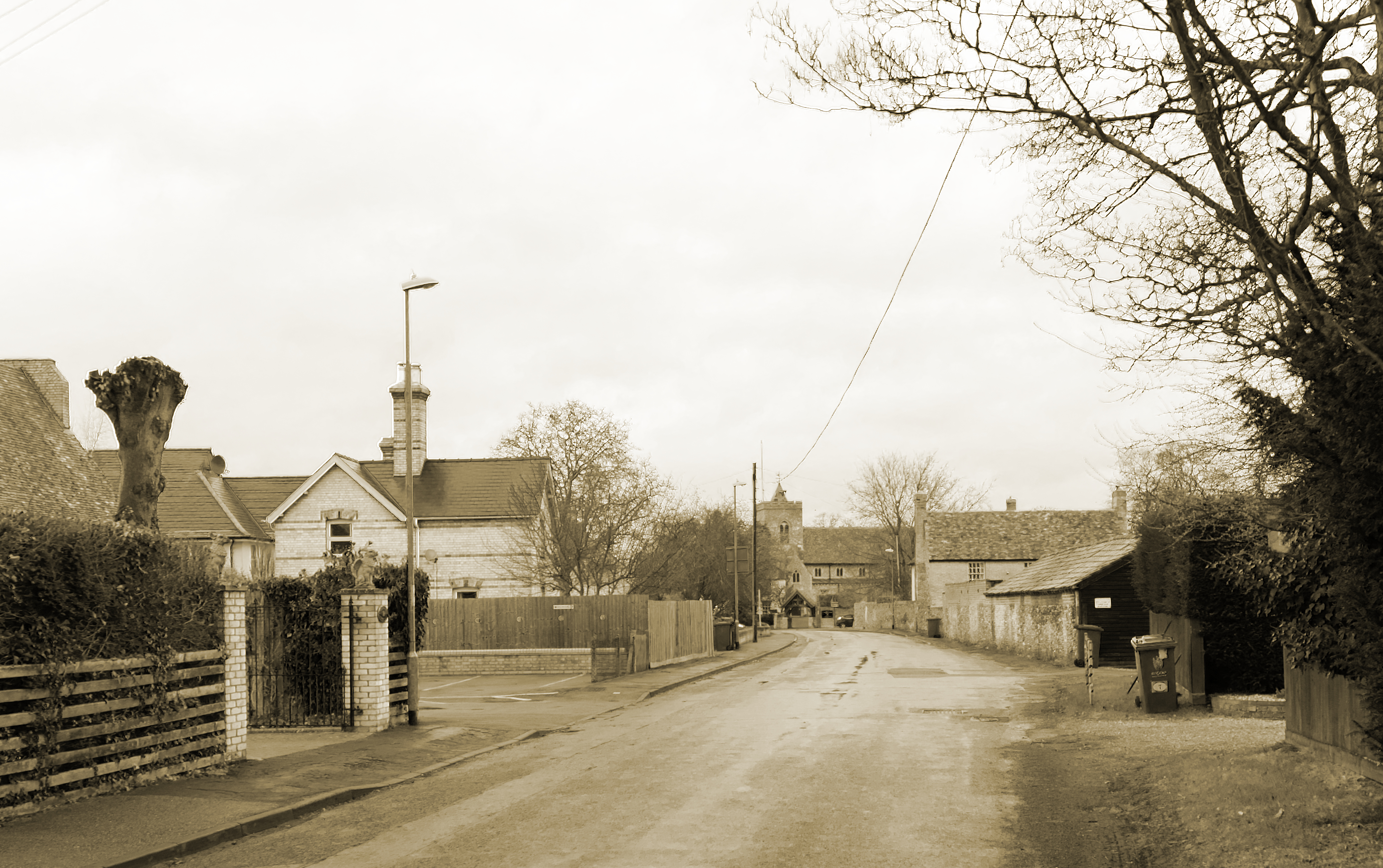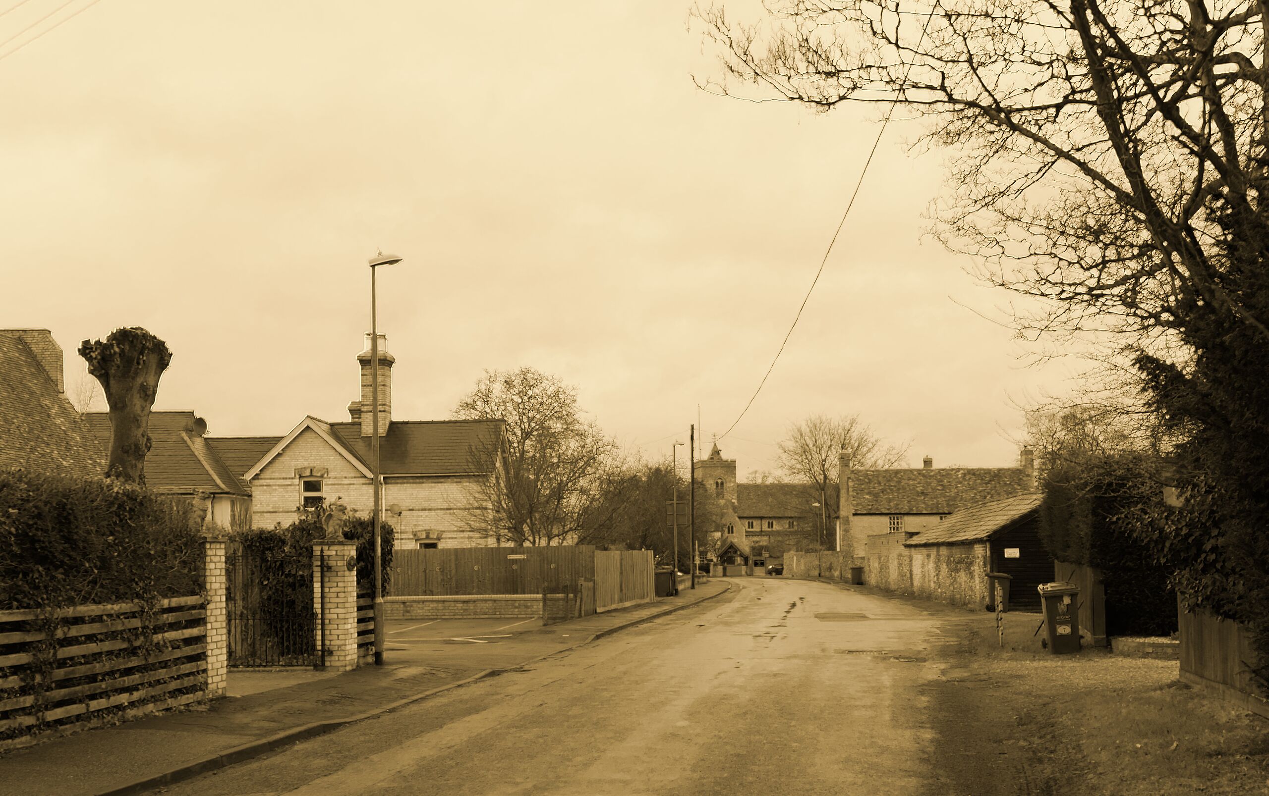 Photograph of School Lane Fulbourn, 2022, with a similar angle to a postcard from circa 1910.